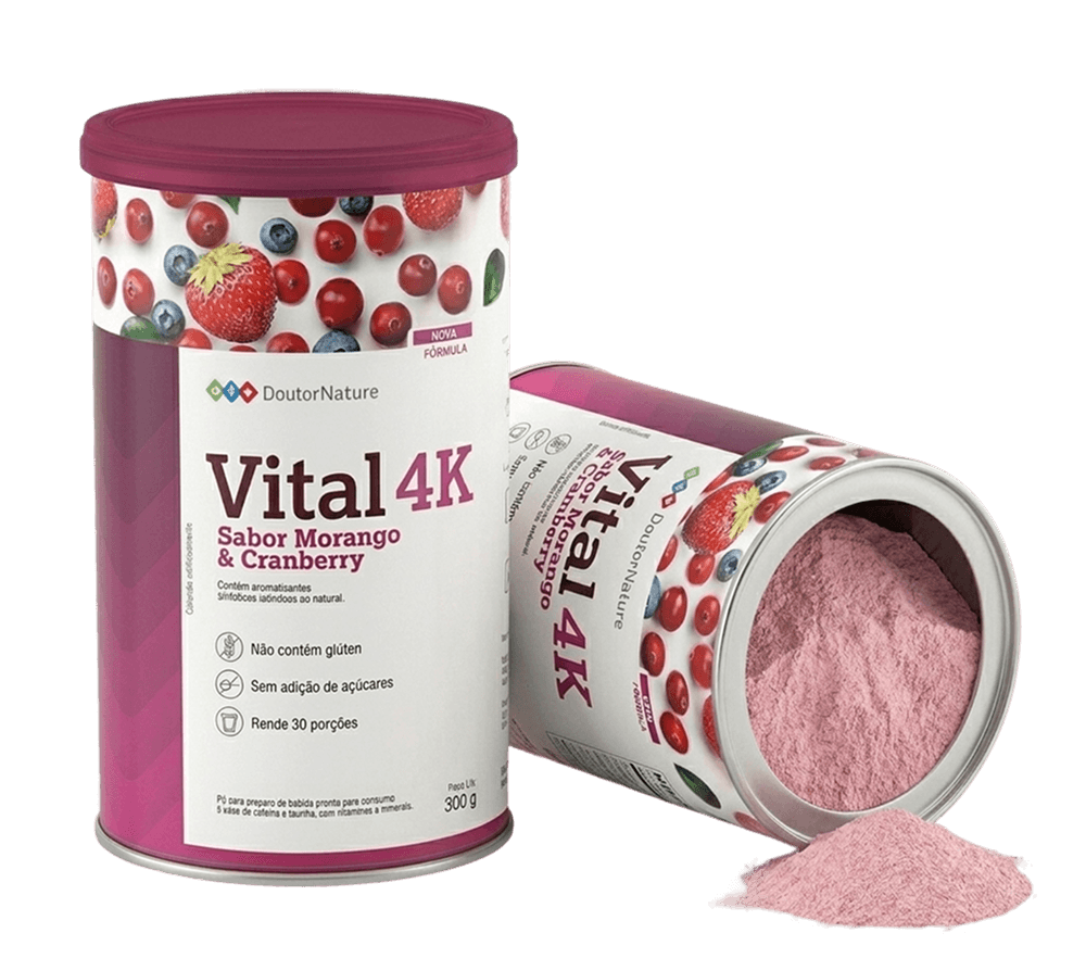 O Vital 4K é um suplemento em pó com polifenóis de frutas vermelhas e roxas, associado a fibras prebióticas. Foi desenvolvido para complementar a rotina diária com foco em bem-estar e equilíbrio intestinal.